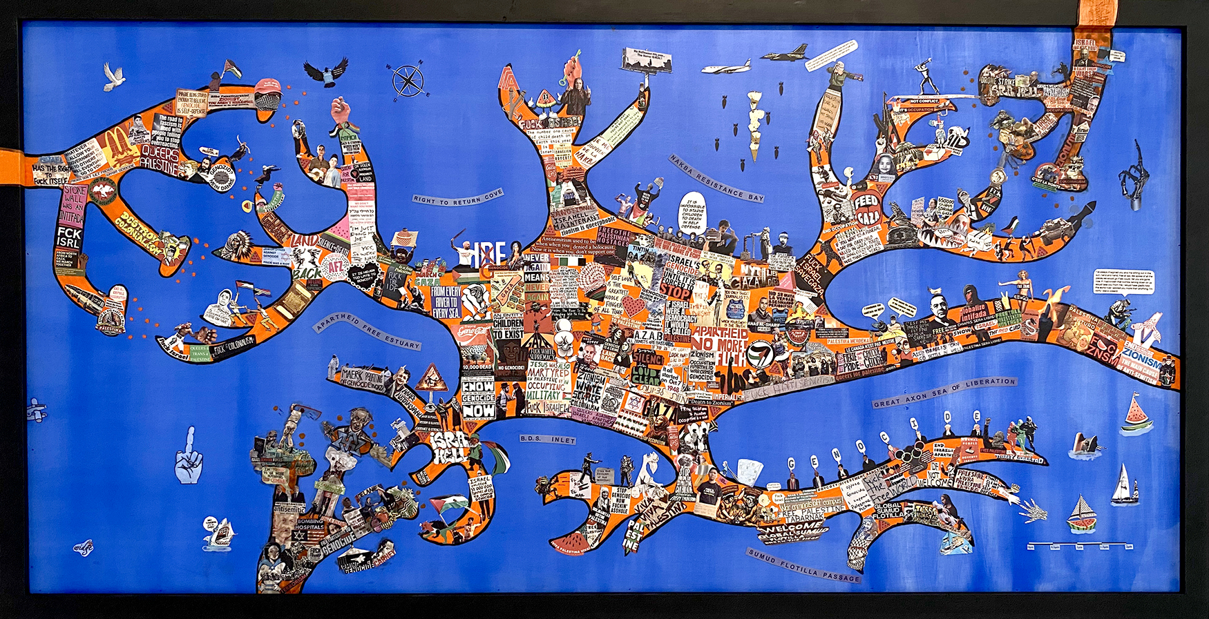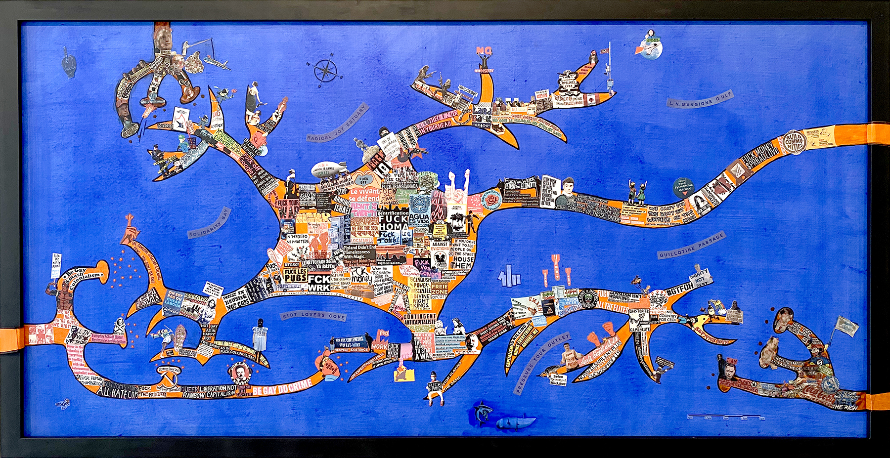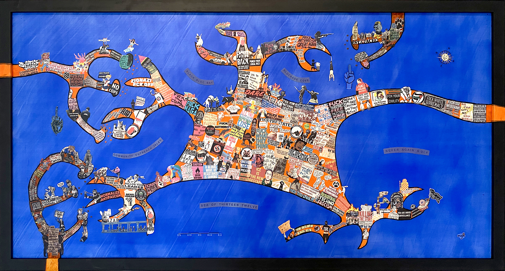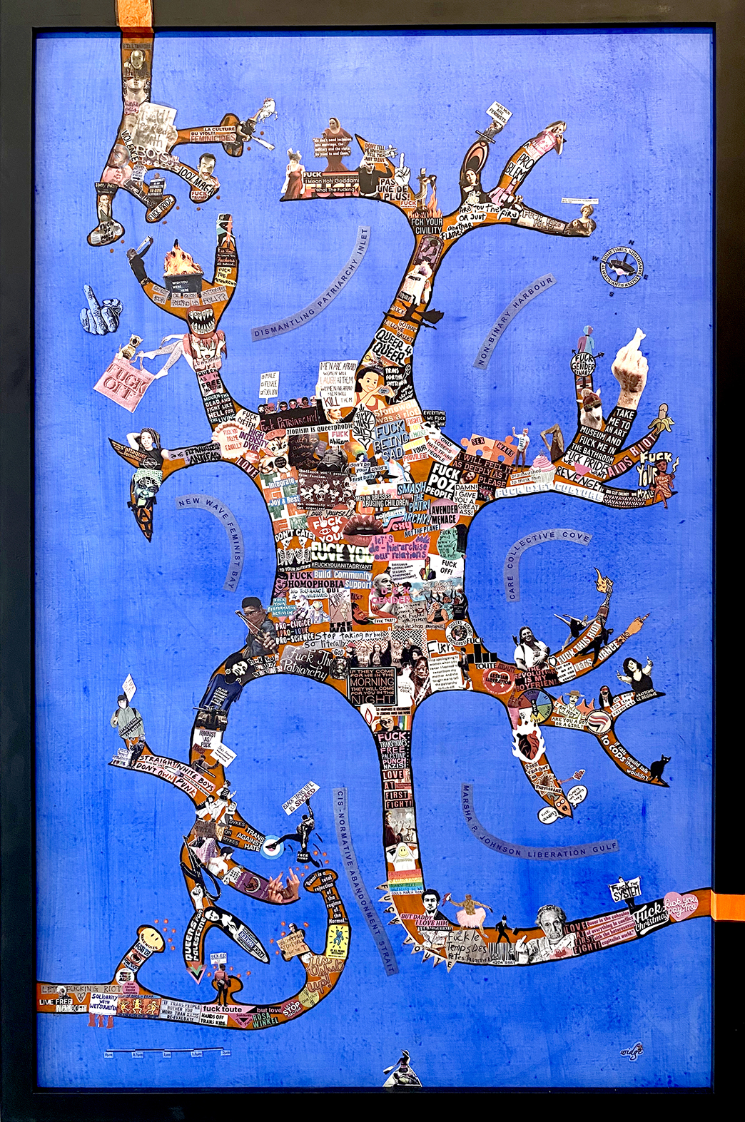 Hundreds of images are scaled, printed and meticulously cut, then pasted onto each of the five large panels. Together, they create complex mind maps of refusal that oppose systems of intolerance.